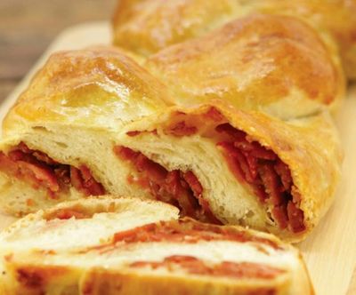 Passado o crescimento da massa, reparta em 3 partes iguais, abra com o rolo em formato retangular e despeje o recheio em 1/3 da massa estendida.